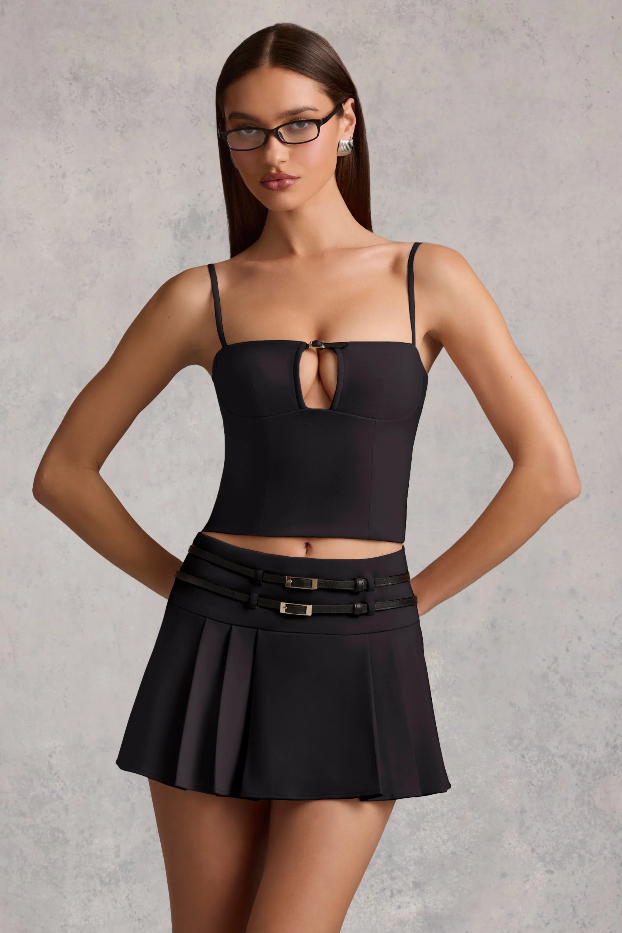 Inspired by ‘90s minimalism, sharp contrasts and clean tailoring, the Velora mini skirt is the perfect balance of timeless with an edge. Crafted from crisp and slightly stretchy suiting fabric with a stretch-satin lining for enhanced coverage and comfort, it’s designed for a low-rise fit and features box pleats for a dynamic finish. It’s elevated with slender functional belts for a perfect fit.
