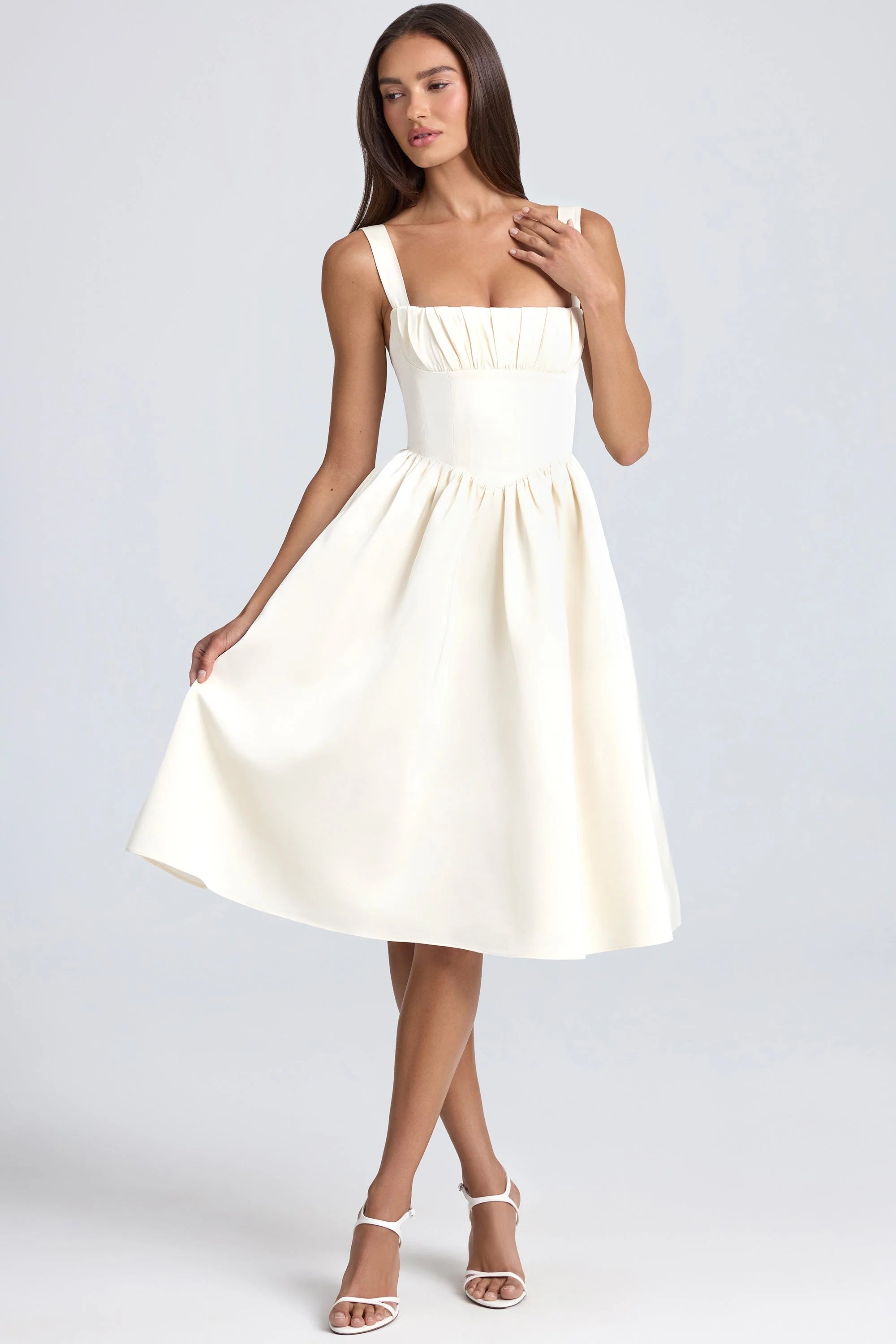 Timeless and romantic: meet the Marguerite midaxi dress. A whimsical silhouette, it’s crafted from lightweight lustrous satin with a fitted bodice that cinches your waist and falls to a full skirt. Available in two timeless hues, it’s framed with a straight neckline enhanced with delicate pleats, tapered shoulder straps with adjustable ties that can be styled into bows at the back and signature lace-up back detailing that can be adjusted for your perfect fit.