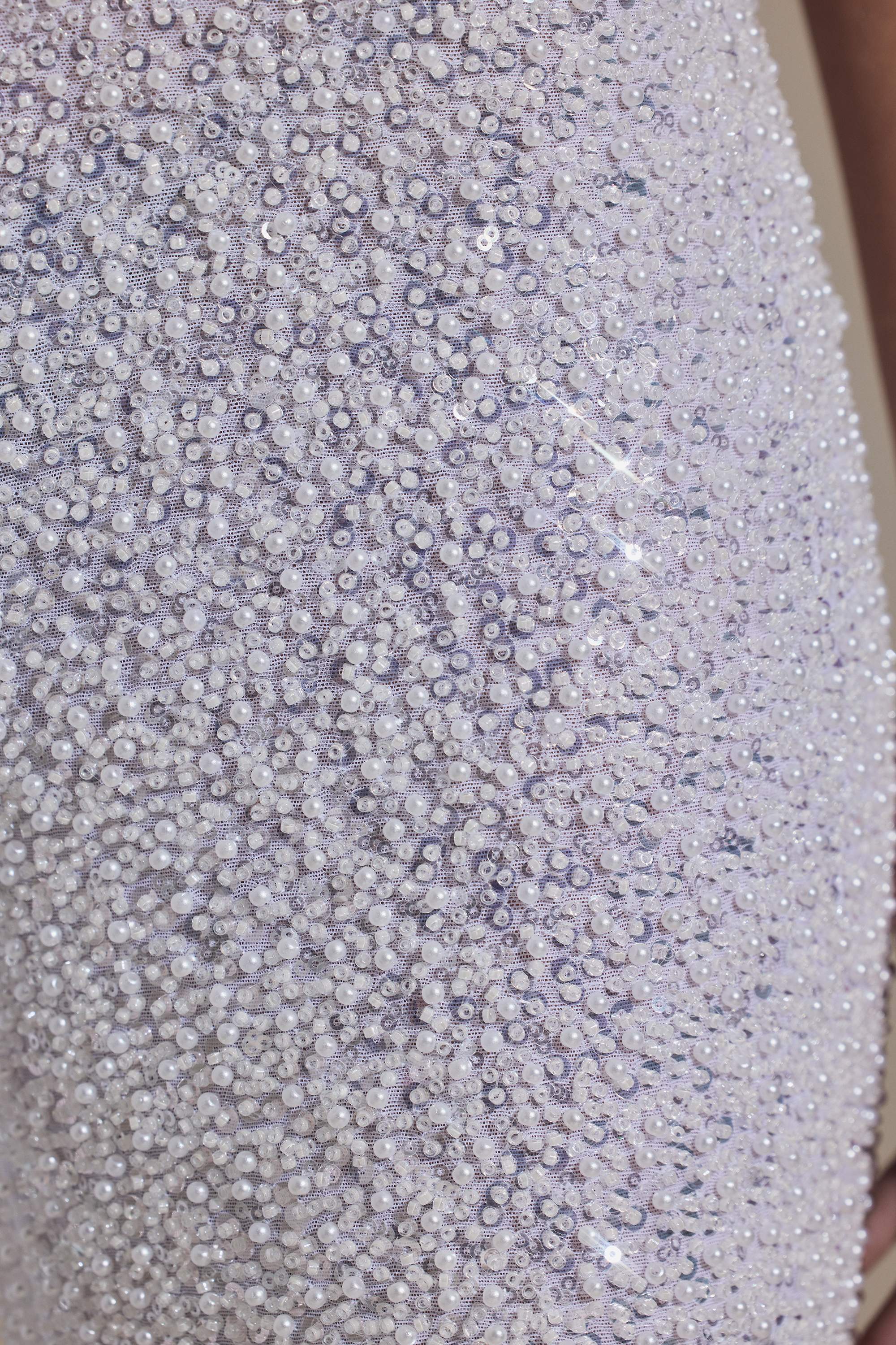 Make a statement. Designed for your most memorable moments, the Coralena jumpsuit is embellished with delicate pearls and sparkling beads. Crafted from premium 20D mesh with a touch of stretch, it’s cut to a figure-enhancing silhouette with a cut-out bodice, flared trousers and an open back. It’s complete with a sweetheart neckline and fixed halter straps for extra support.