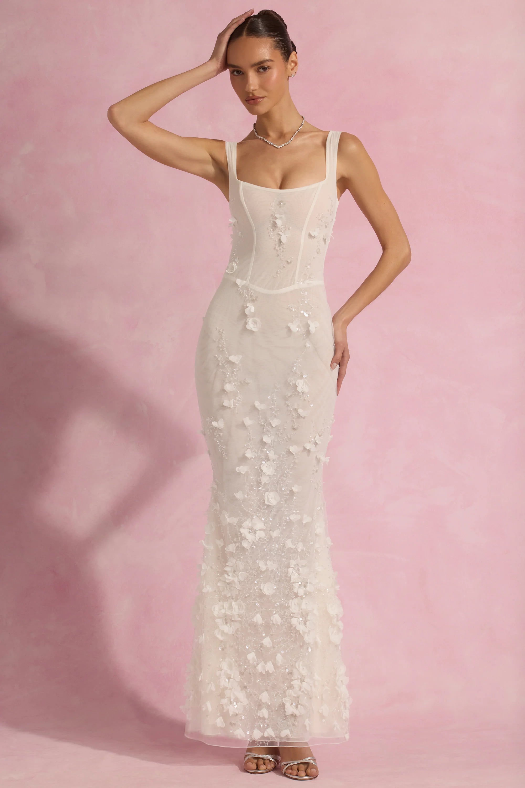 Wearable works of art for your most special occasions, the Vasanta gown is adorned with delicate tonal floral appliqués brought to life with perfectly placed sequin embellishments. It’s crafted from lightweight, semi-sheer premium mesh that hugs your curves and is lined with signature power mesh for a non-restrictive sculpting effect. It’s cut to a classic fishtail silhouette with lace-up detailing at the back and adjustable straps for your perfect level of support.