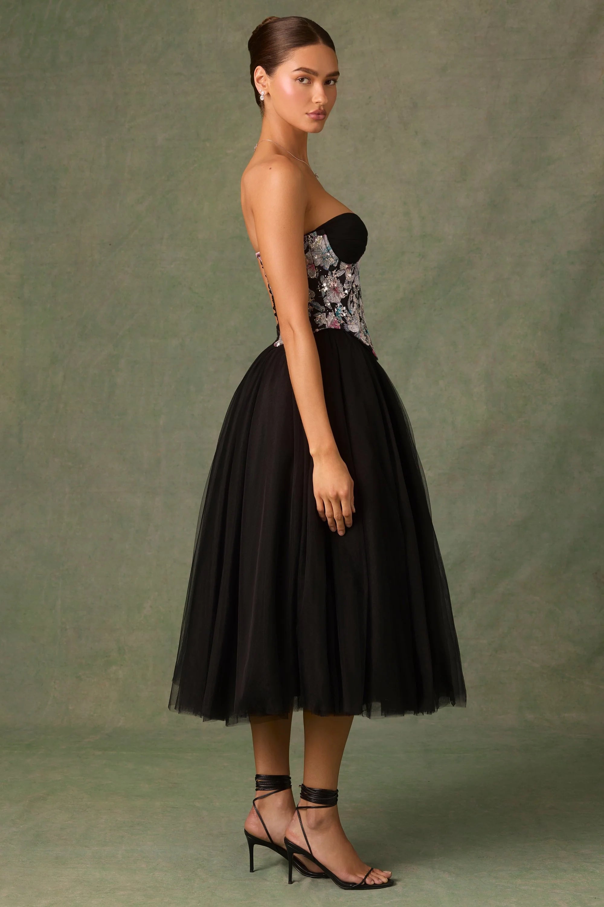 A fresh take on classic styles, the Elia corset is designed to add interest to any look. It’s crafted from figure-defining mesh fabric, overlaid with custom watercolour-inspired floral appliqués and the perfect topping of sparkling sequins. Cut to a cupless silhouette for versatile styling, it’s framed with a curved hem for instant sculpting and features an adjustable lace-up back for your perfect fit every time.
