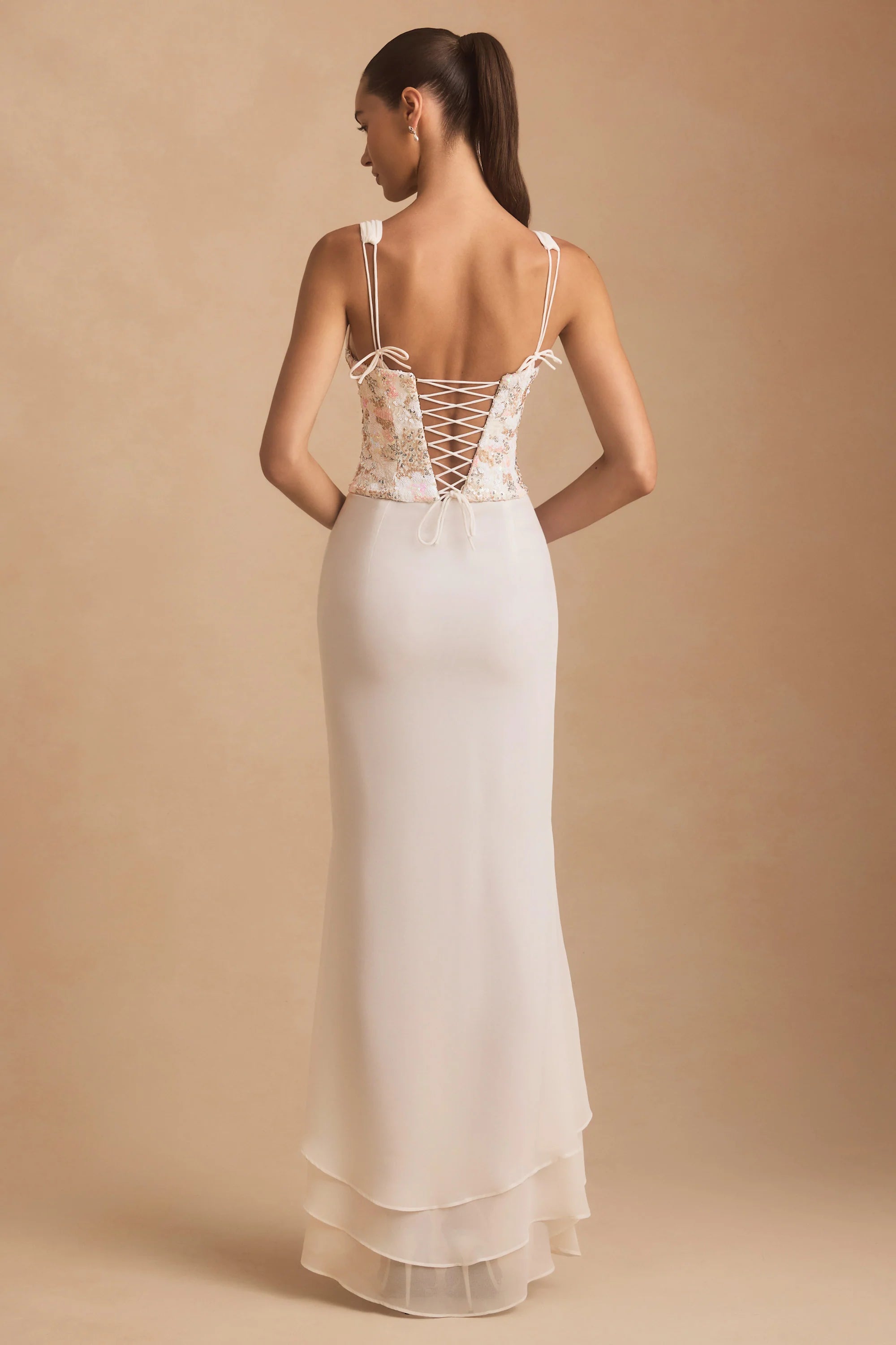 Worth making plans for, the Nathalia maxi dress is cut from lightweight chiffon with a plunging V-neckline, waterfall split hem and statement lace-up back. It’s overlaid with a waist-cinching corset decorated with coral-inspired embellishments that sparkle under spotlights. The rouleau straps are fully adjustable for your perfect fit.