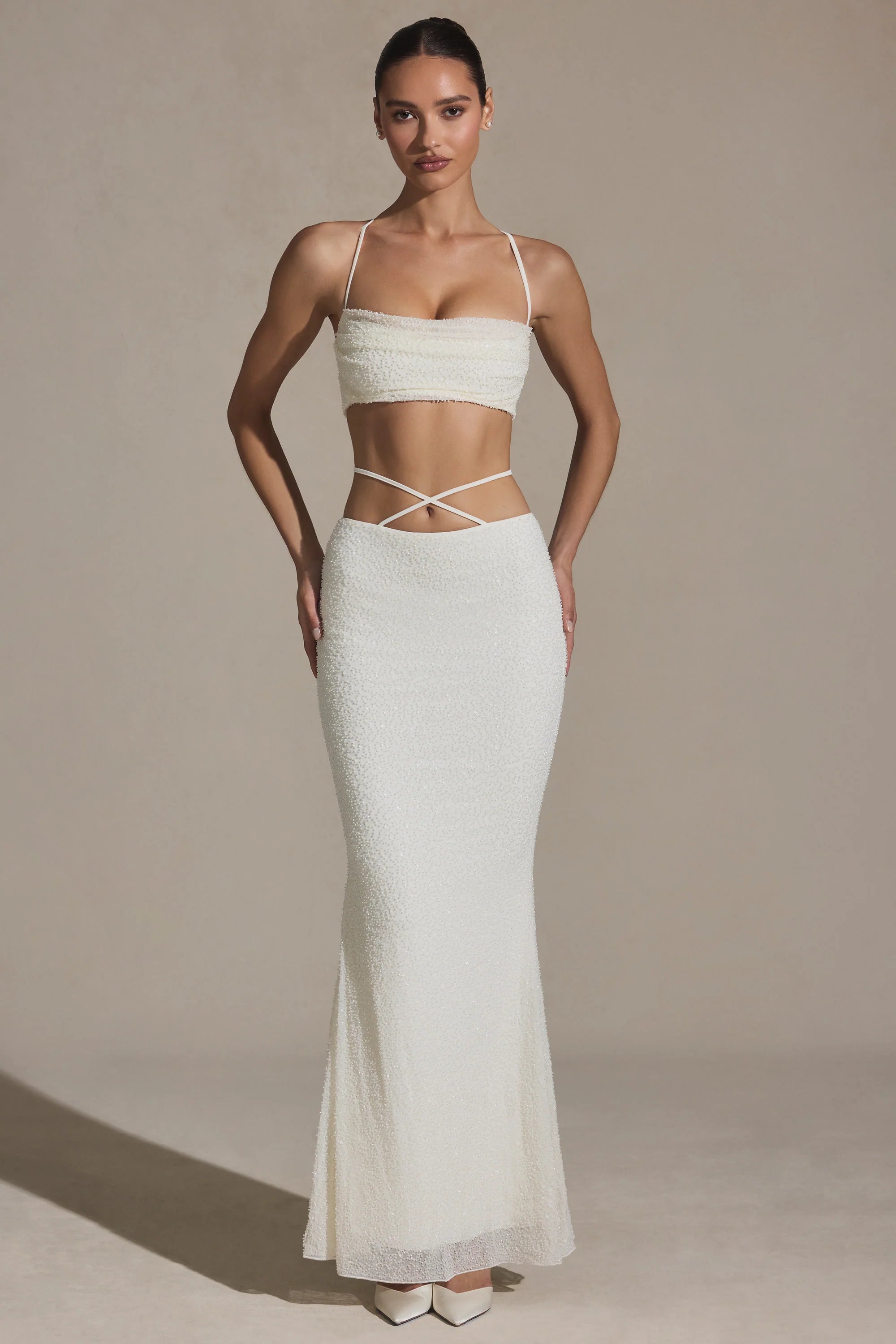 High-impact silhouettes. Perfect for your most memorable occasions, the Sardinia maxi skirt is crafted from our premium, dual-layered mesh fabric and fully embellished with delicate sparkling beads. It’s elevated with cross-over straps that sculpt the waist and add a contemporary edge to a classic silhouette.